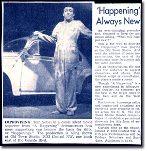 whole new style of theatre with his "Happenings." According to a review in the Albuquerque Journal: "(A 'Happening' is) an ever-changing presentation designed to keep the audience asking 'What will happen next?'" |